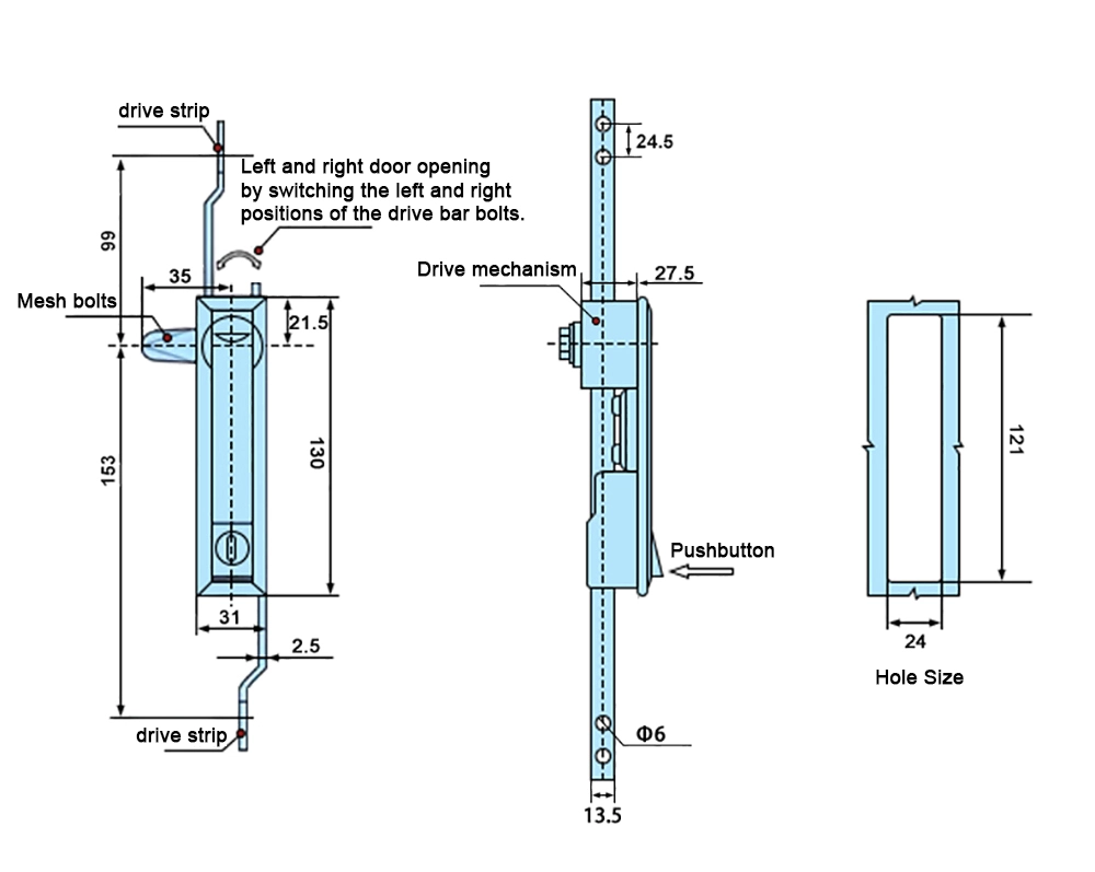 Încuierea ușii din oțel inoxidabil este din oțel inoxidabil în culoarea originală din oțel inoxidabil pentru durabilitate și rezistență la coroziune. Mărimea de deschidere este de 24 mm × 121 mm, asigurând compatibilitatea cu configurațiile standard de instalare.